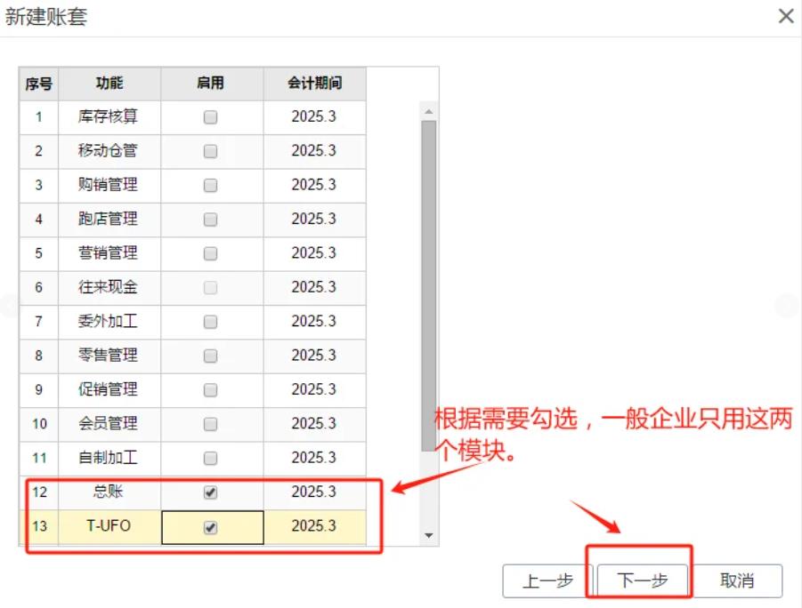 4. 勾模块&设参数:仅勾已购模块,选计价模式(仓库+存货/存货)、实时计价,点下一步。