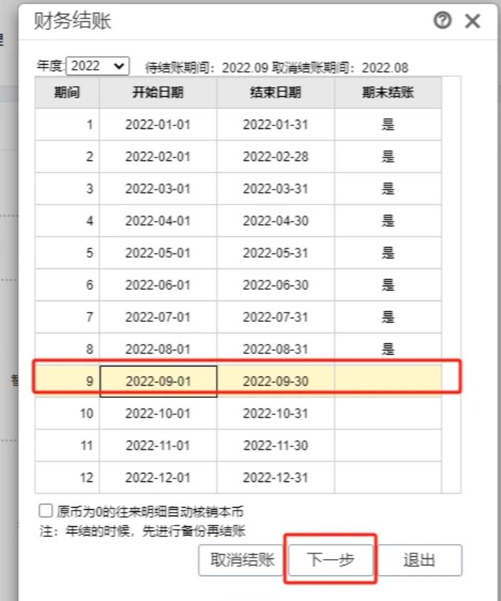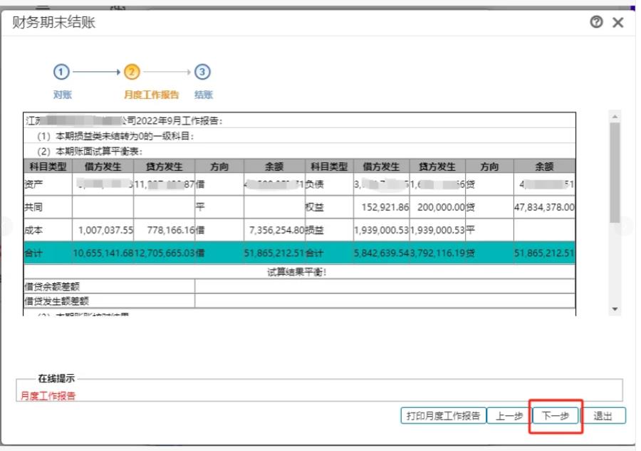 操作步骤 1、打开系统管理—财务结账 2、点击财务结账,可以看到已期末结账月份和未结账月份,选中最后一个结账月份可以取消结账 3、选中第一个未结账月份点击下一步,需要核对账簿 4、核算全部正确可以点击下一步,有错误项,可以点击查看对账错误明细 5、点击查看月度工作报告 6、全部通过即可进行结账并退出
