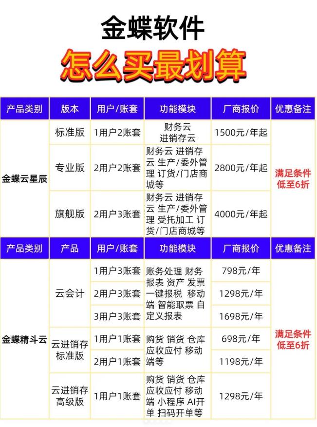 我整理了金蝶云星辰、云会计以及云进销存产品的版本对比、全新的产品报价和全新的折扣政策哦!
