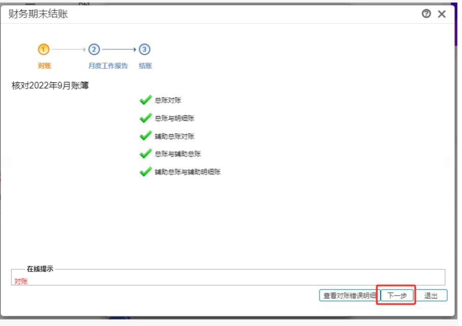 操作步骤 1、打开系统管理—财务结账 2、点击财务结账,可以看到已期末结账月份和未结账月份,选中最后一个结账月份可以取消结账 3、选中第一个未结账月份点击下一步,需要核对账簿 4、核算全部正确可以点击下一步,有错误项,可以点击查看对账错误明细 5、点击查看月度工作报告 6、全部通过即可进行结账并退出
