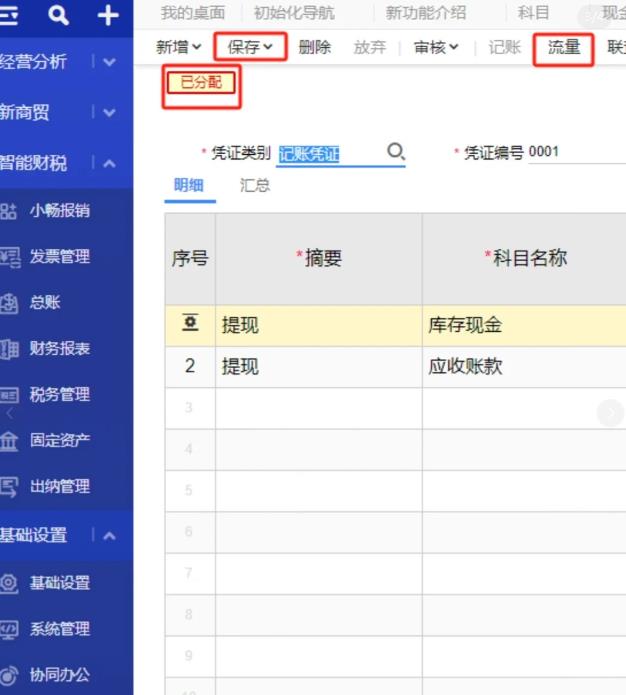 (1)自动分配:在凭证界面点击【流量】菜单,凭证保存后软件会自动针对符合要求的凭证分配流量;